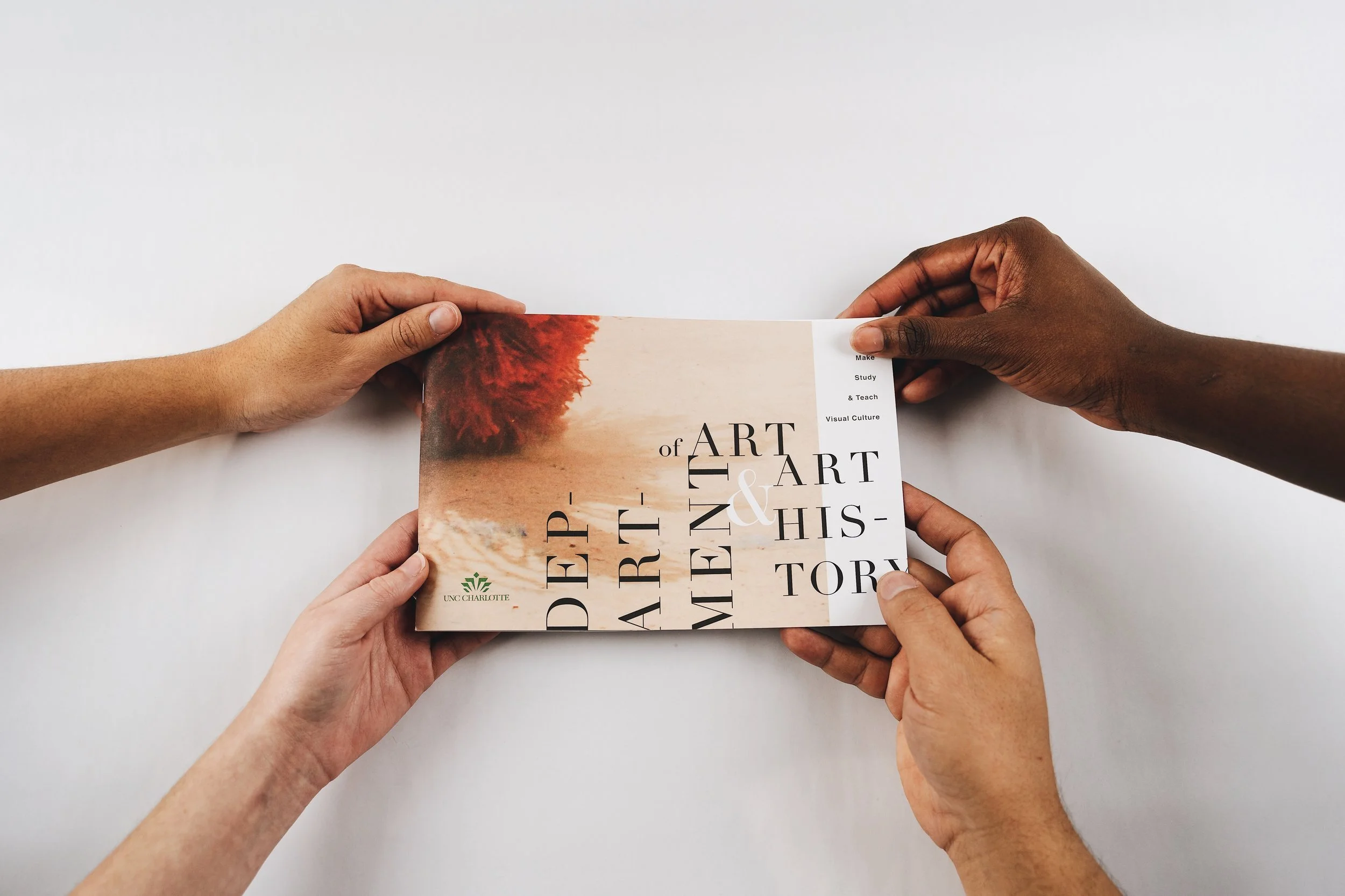 As a team of ten, we created a promotional booklet for UNC Charlotte’s college of Art + Art History. Our idea was to showcase students, their work, and the creative ideas that fuel their work. We wanted the book to feel less like a collegiate informational, and more like an artistic invite. In order to achieve that, we decided to use more experimental typography, a more casual voice in the copy, and dynamic layouts. In order to emphasize the location of our school, we included vellum inserts that showcase key locations in charlotte that are related to the arts such as: the Bechtler Museum, Goodyear Arts, various advertising agencies, art-related programs and events.